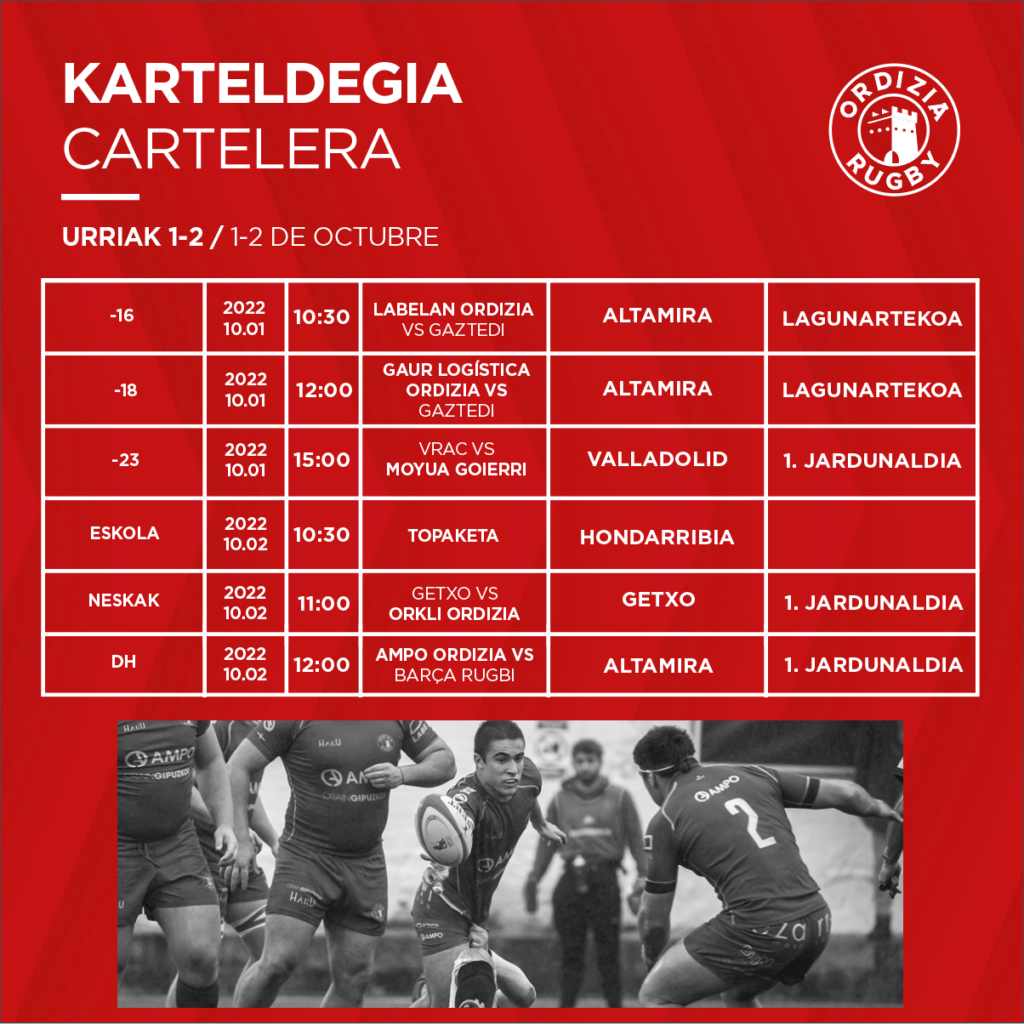 Eta igandean, lehenengo taldearen partidez gain, beste bi hitzordu izango ditugu. Neska taldeak denboraldiari hasiera emango dio Getxon 11:00etan, eta eskolako gaztetxoak 10:30etan topaketa izango dute Hondarribian.