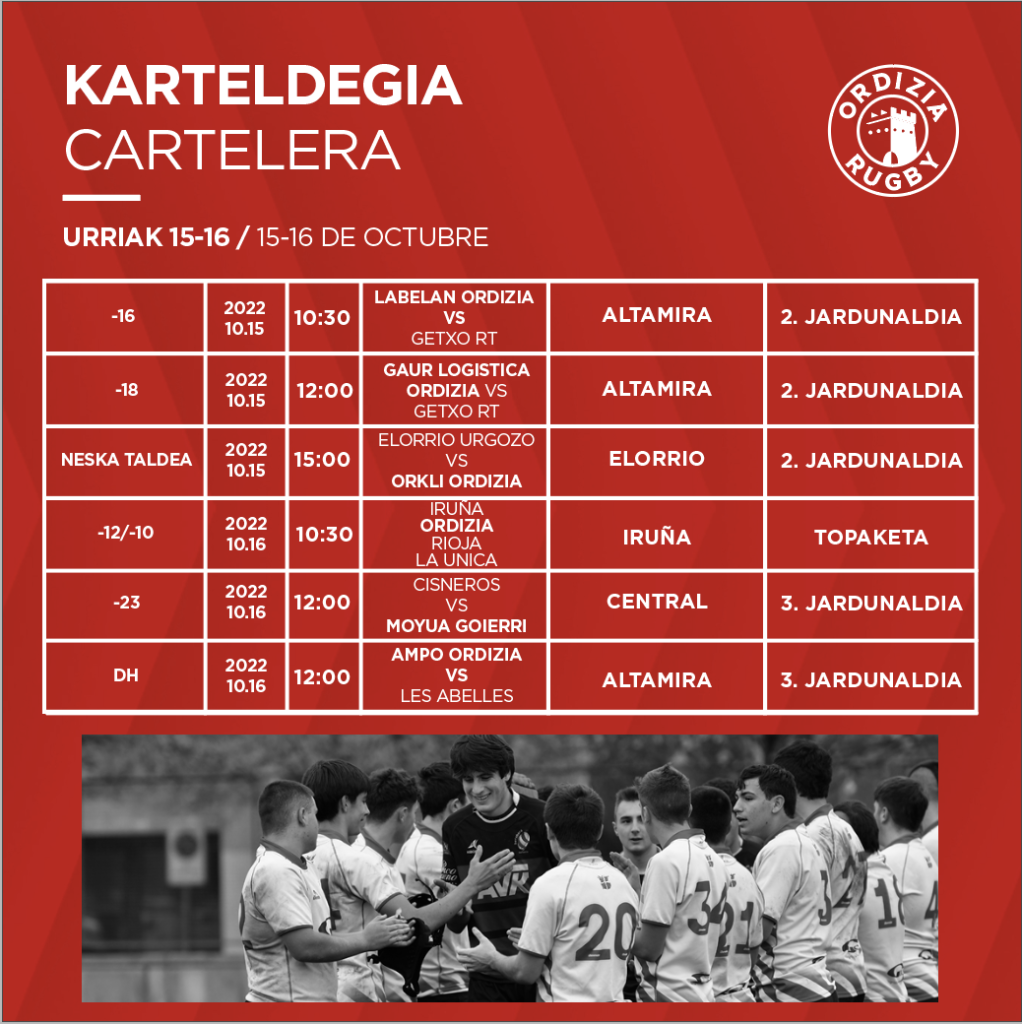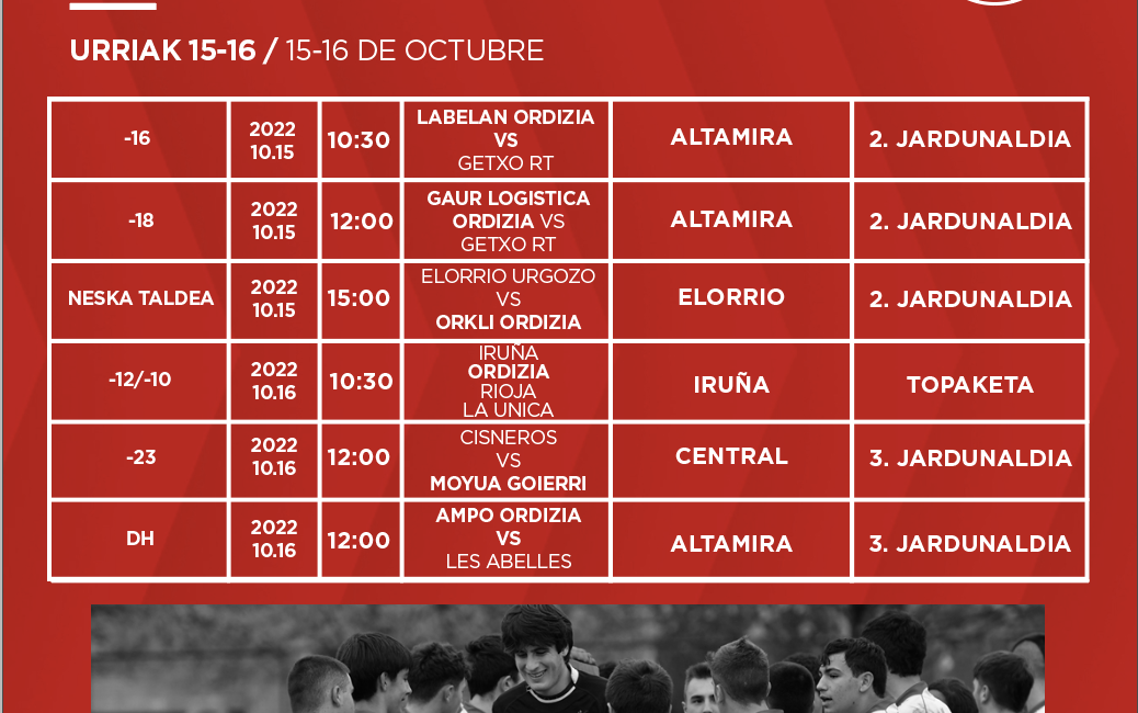 Neska taldeak Elorriora bidaiatuko du larunbatean 15:00etan Elorrio Urgozo taldearen kontra indarrak neurtzeko. Eta, amaitzeko, eskolako gazteek topaketa izango dute Iruña, La Unica, eta Riojarekin batera larunbatean 10:30etan Iruñan.
