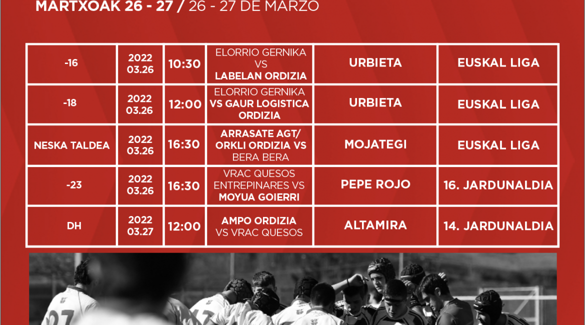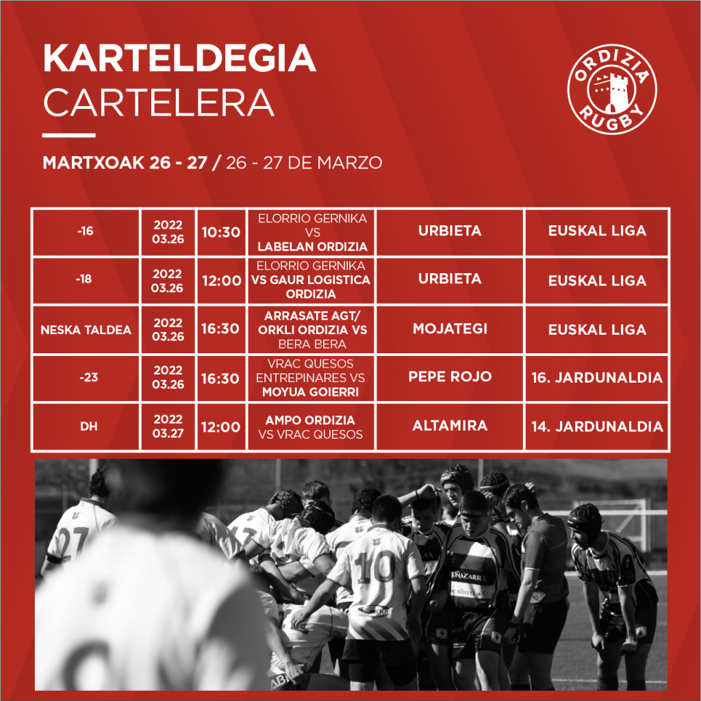 Harrobiari dagokionez, Labelan Ordizia 16 urtez azpikoak eta Gaur Logística 18 urtez azpikoa kElorriora joango dira larunbatean 10: 30etik 12: 00etara euskal ligako partidak jokatzeko. Liga berean Arrasate-Orkli Ordiziako neskek Donostiako Bera-Bera hartuko dute larunbatean arratsaldeko 16: 30etan Mojategin. Azkenik, eskolako txikienek prestakuntza prozesuarekin jarraituko dute igandean 9: 30etatik aurrera Altamiran.
