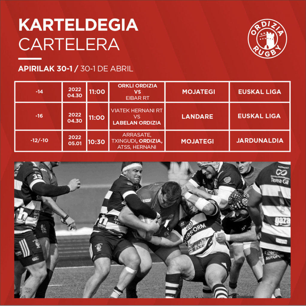 Joan den asteko emozioen ondoren badirudi karteldegia leunagoa dela eta atseden pixka bat ematen diela Ordizia Rugby Elkarteko zaleei. Asteburu honetan bi partida jokatuko dituzte gure taldeek, behe mailakoak. Lehenengoa larunbatean jokatuko da Ordizian 11: 00etan Eibarren aurka eta -14ak jokatuko du, eta bigarrena Landareko zelaian izango da, Hernaniren aurka 11:00etan.