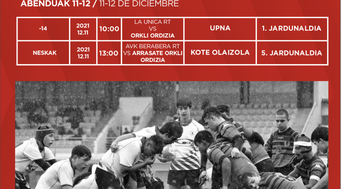 Euriz pasatako asteburua espero dugu aurrtetik duguna, eta arrazoi horrengatik, bi partida soilik jokatuko dira. Arrasate Orkli Ordiziak Bera Beraren aurka jokatuko du larunbatean, 13: 00etan, Kote Olaizola zelaian, eta larunbatean ere, Iruñean, 14 urtez azpikoak La Unicaren aurka lehiatuko dira 10: 00etan.