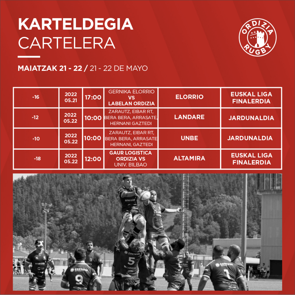 Horrela, igandean 18 urtez azpikoen txanda izango da. Gaur Logística Ordiziak etxean jokatuko du, Altamiran, 12: 00etan, Uni Bilboren aurka, eta aurreko egunean, larunbatean, 17: 00etan, gure 16 urtez azpikoen txanda izango da, Labelan Ordiziarentzat, Elorriora joango baita taldea Gernika-Elorrio konbinatuaren aurka jokatzeko.