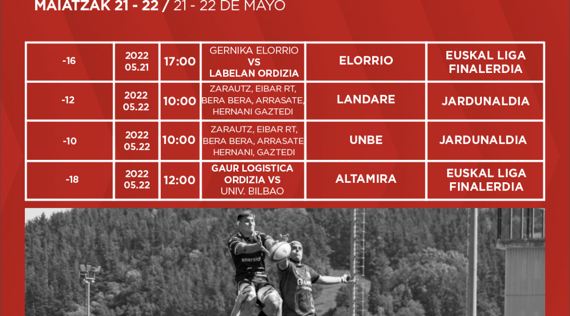 Gainera, Errugbi Eskolarako irteera. – 10 Eibarko Unbe estadiora joango da, igandean, 10: 00etatik aurrera, Zarautz, Eibar, Arrasate, Gaztedi eta Hernanirekin ospatuko diren errugbi topaketetan gozatzeko. Egun eta ordu berean, baina Hernaniko Landare zelaian, -12rako saioa, -10ekoen klub berberekin. Ondo pasa!