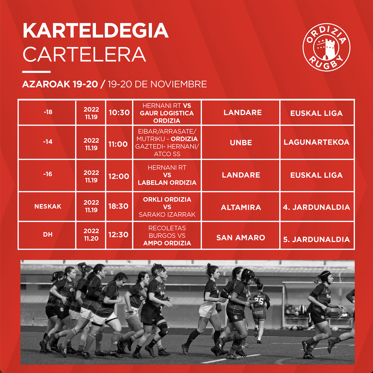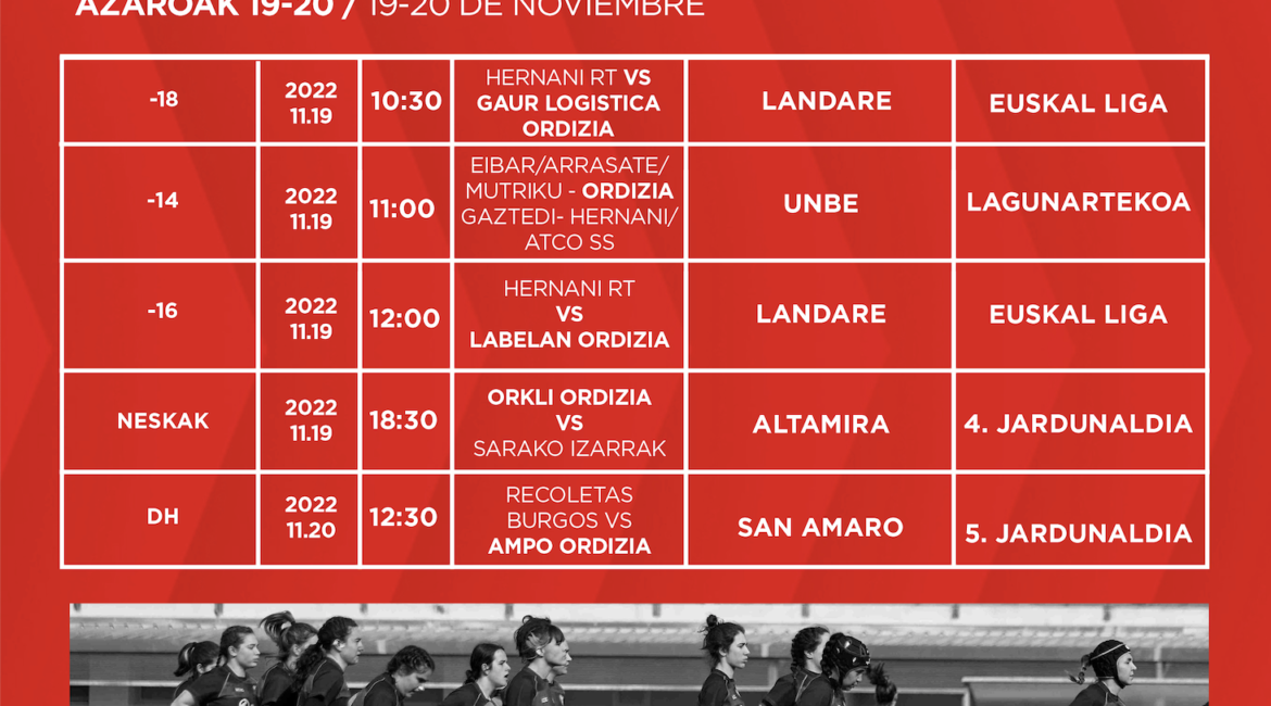 18 urtez azpiko taldeak emango dio hasiera asteburuari larunbatean 10:30etan Hernaniren kontra Landaren. 14 urtez azpiko taldeak topaketa izango du Unben, parte hartzaileak, Eibar/Arrasate/Mutriku, Ordizia, Gaztedi Hernani/ATSS izango dira. 16 urtez azpiko taldeak, ere, Hernanin jokatuko du 18 urtez azpiko taldearen partidaren ondoren, 12:00etan. Eta, amaitzeko, Neska taldeak ligako laugarren jardunaldia jokatuko du larunbatean, 18:30etan Altamiran Sarako Izarrak taldearen kontra.